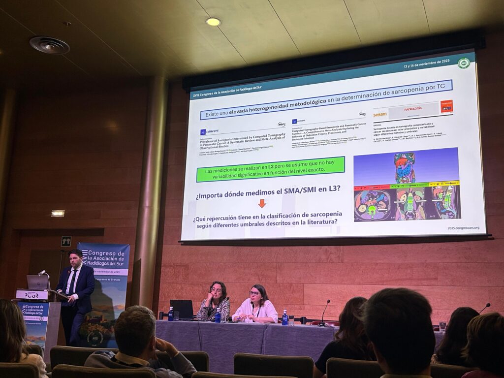 La experiencia fue tremendamente enriquecedora. Nuestro compañero, el doctor Antonio Bossini, presentó una comunicación oral titulada «Variabilidad de las mediciones de músculo esquelético total y clasificación de sarcopenia según diferentes localizaciones de la vértebra L3», donde expuso los resultados más recientes de nuestra línea de investigación sobre composición corporal y sarcopenia. Su intervención generó un interesante debate sobre la estandarización de las mediciones en imagen médica.